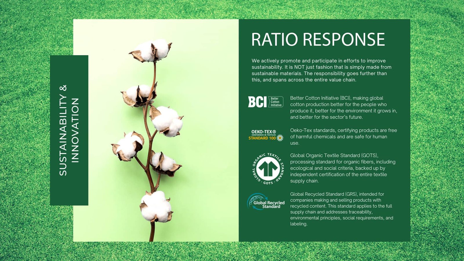 Ratio can provide any kinds of fashionable apparels as per buyer’s requirement. We can handle small to large quantity of orders with quality assurance. We also conduct final inspection on behalf of the buyer.
