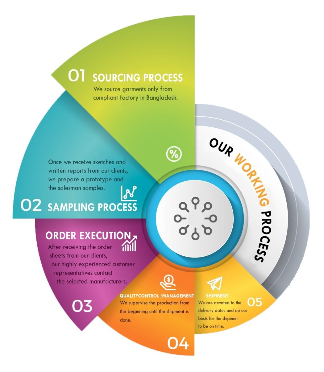 We source garments only from compliant factory in Bangladesh. Upon placement of orders, We closely monitor buyer’s requirement and assign a team to follow up that order closely. We always prioritize buyers need. Due to that our team must be well conversant with buyers manual and ensure they relate all this information to vendor’s key personal. We source fabrics from reputed mills in Taiwan, China, Indonesia and India.